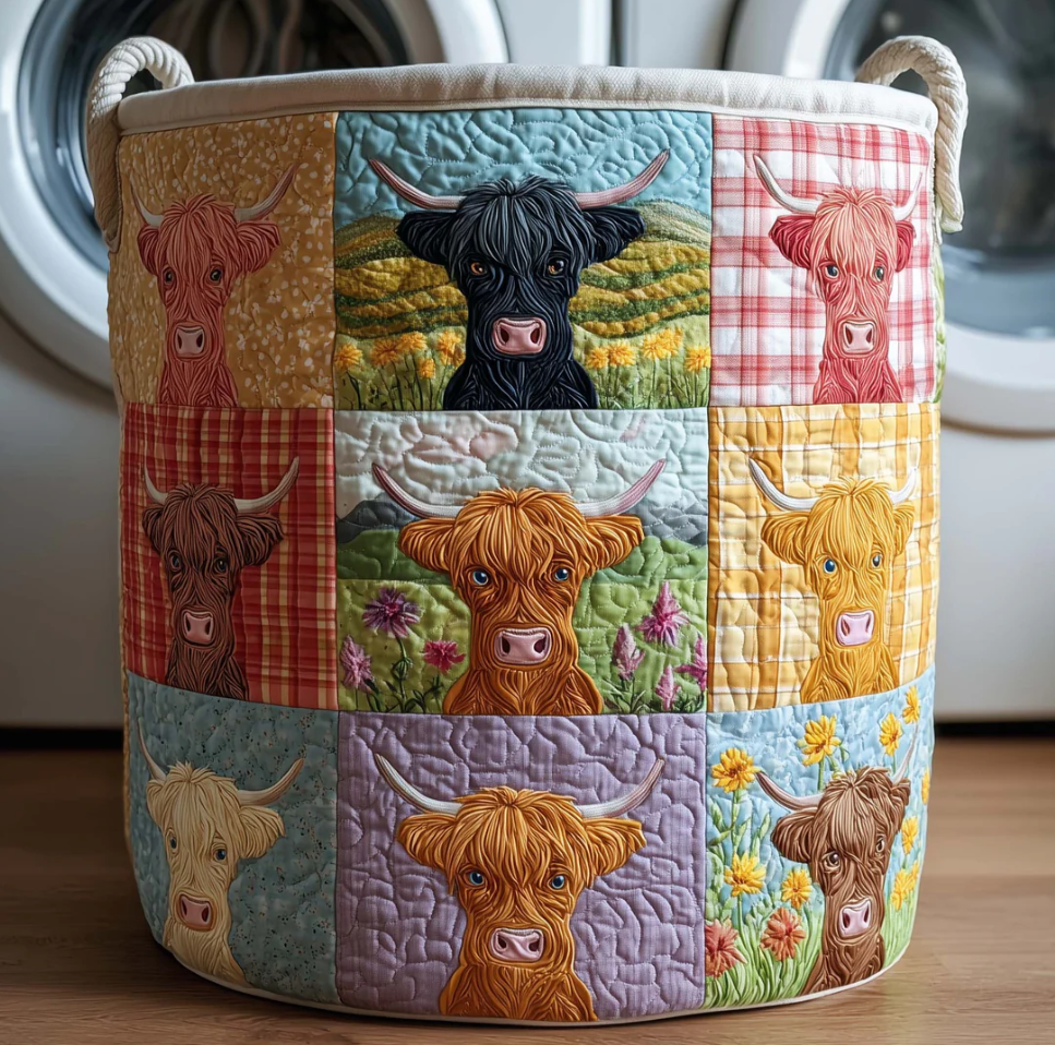 Charming Highland Cow Patchwork Pattern Quilted Laundry Basket Eco-Friendly Machine Washable Storage Bin for Home Farmhouse Decor Organization | Cow