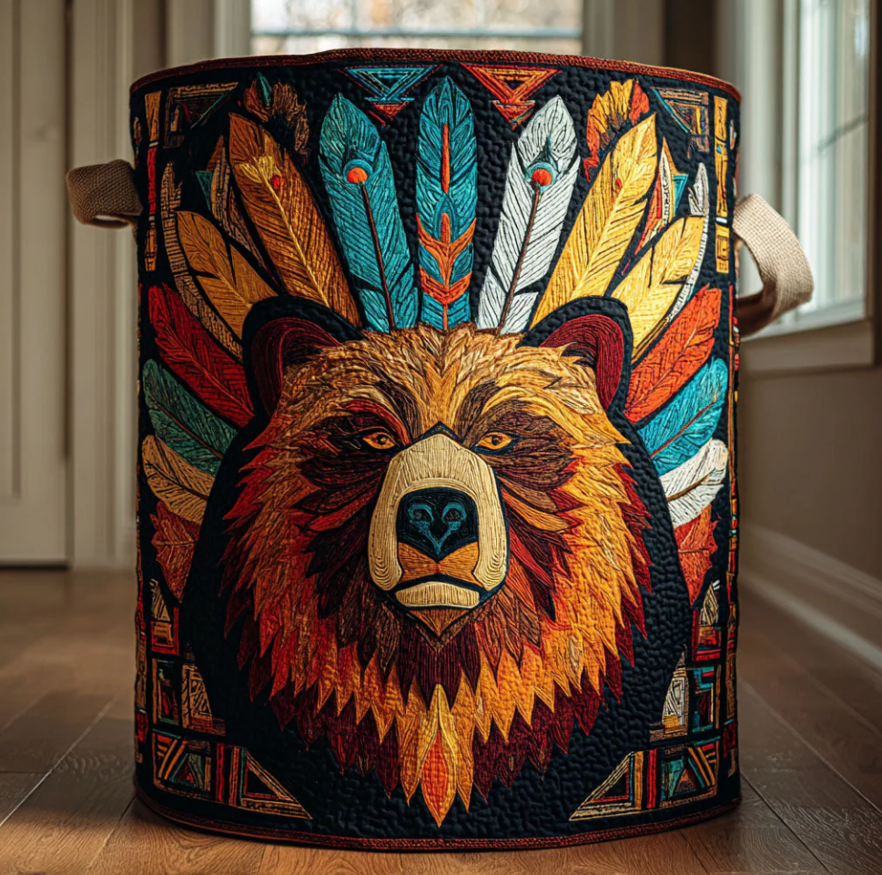 Vibrant Tribal Bear Pattern Quilted Laundry Basket Eco-Friendly Machine Washable Storage Bin for Home Rustic Cabin Decor Organization | Bear