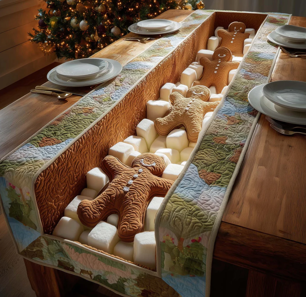 Marshmallow Lane Quilted Table Runner Gingerbread Man Marshmallow Path Pattern Dining Table Flag for Home Decor | Gingerbread Man