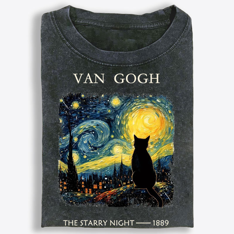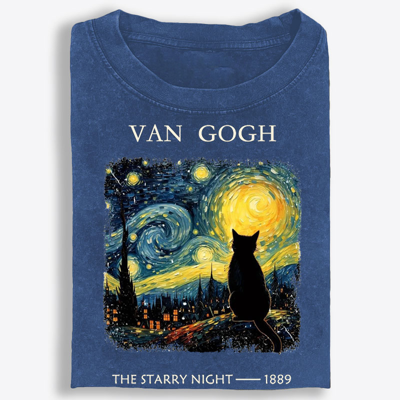 Van Gogh Starry Night CatRetro Washed T-Shirt | 100% Cotton | Streetwear Essential