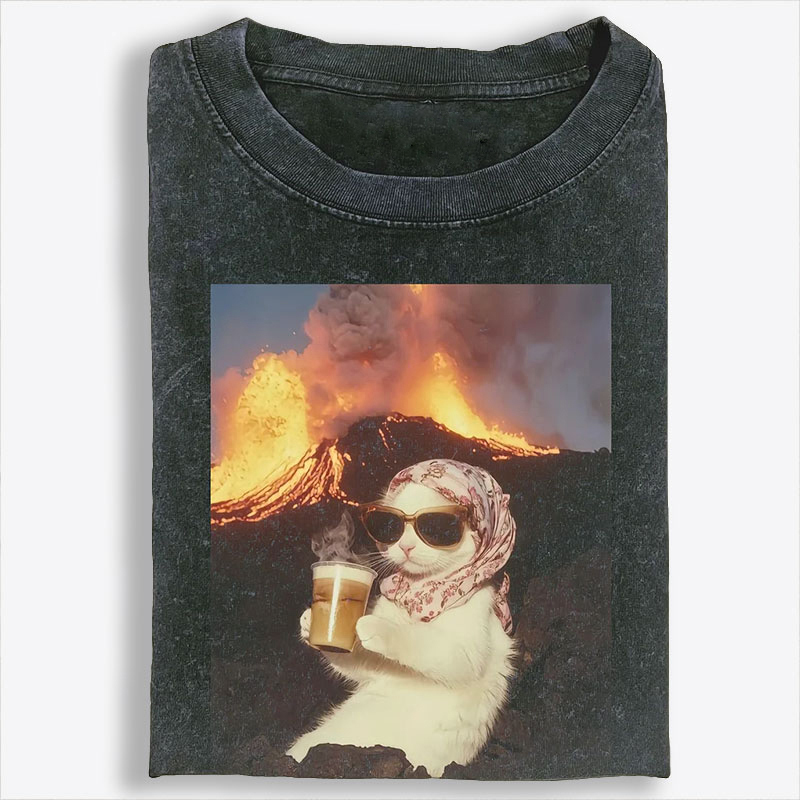 Volcano Coffee Cat Meme Retro Washed T-Shirt | 100% Cotton | Streetwear Essential