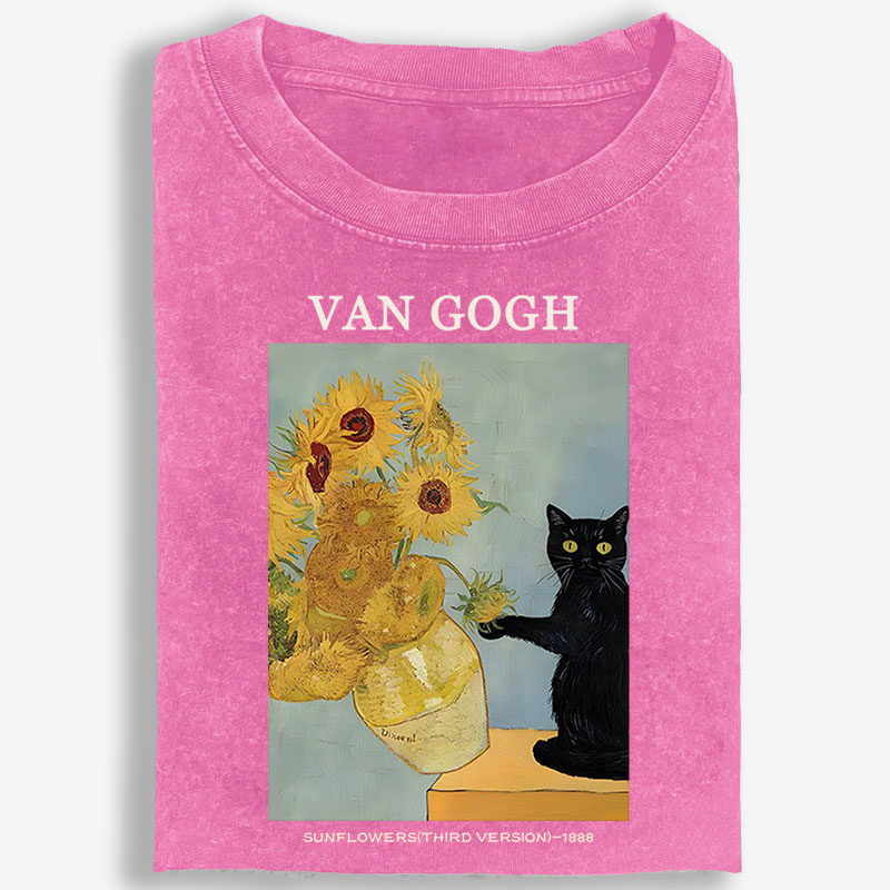 Playful Cat Meets Van Gogh Sunflowers Retro Washed T-Shirt | 100% Cotton | Streetwear Essential
