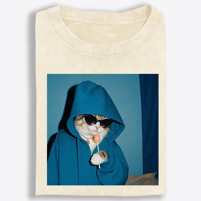Hoodie Cat with Lollipop Cool Guy Retro Washed T-Shirt | 100% Cotton | Streetwear Essential