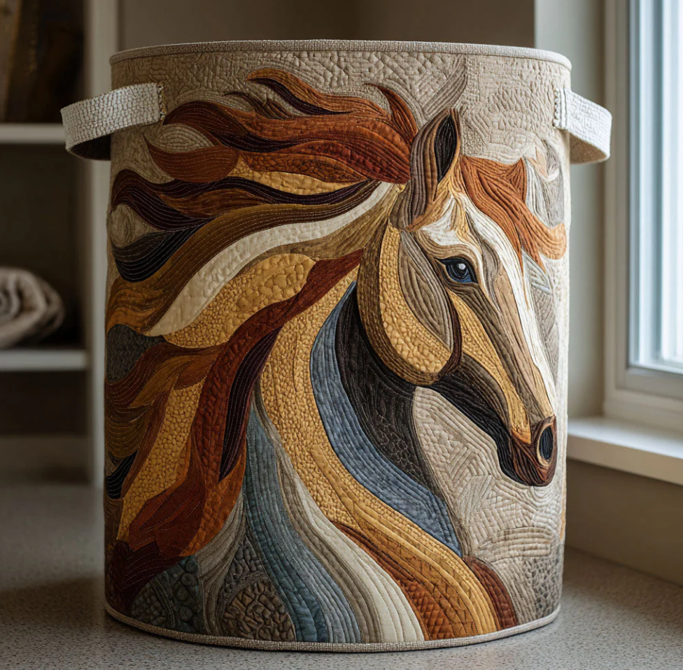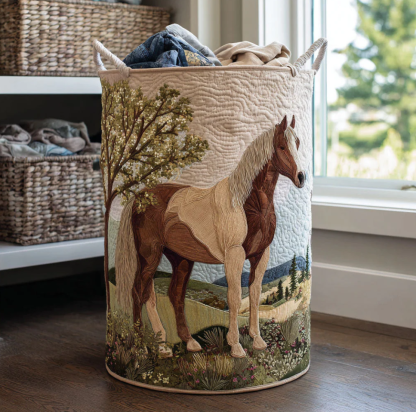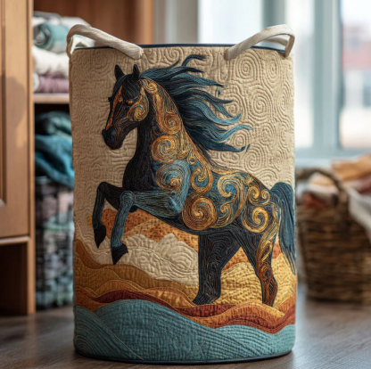 Artistic Galloping Horse Pattern Quilted Laundry Basket Eco-Friendly Machine Washable Storage Bin for Home Rustic Countryside Decor Organization | Horse