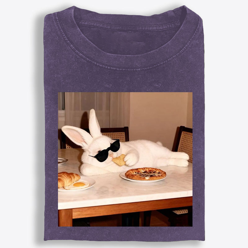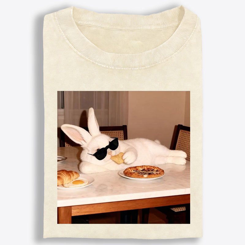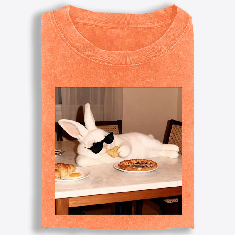 What makes this tee stand out is the graphic. Featuring a playful, attitude-filled bunny stretched out across the table in dark sunglasses with pastries in front, this design captures the ultimate brunch-mode, unbothered boss energy. The candid photo-style composition gives the artwork a casual lifestyle feel, while the contrast between the bunny’s cute appearance and its laid-back swagger makes it instantly funny, stylish, and full of personality. It is the kind of graphic that feels relaxed, trendy, and impossible not to notice.