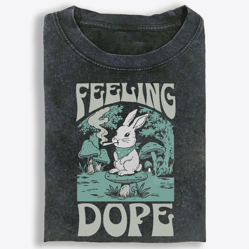 Retro psychedelic bunny graphic with “Feeling Dope” statement text