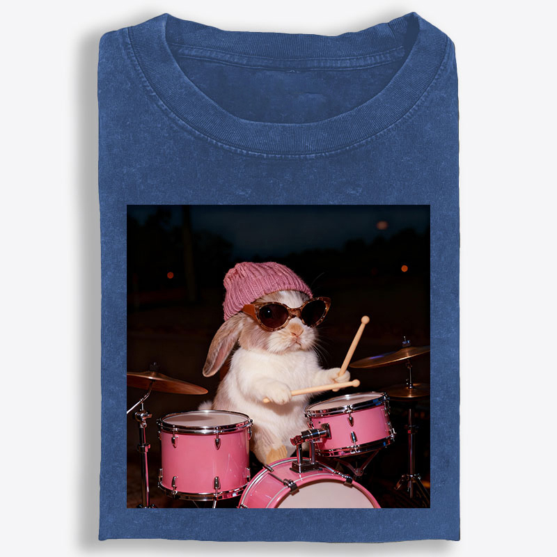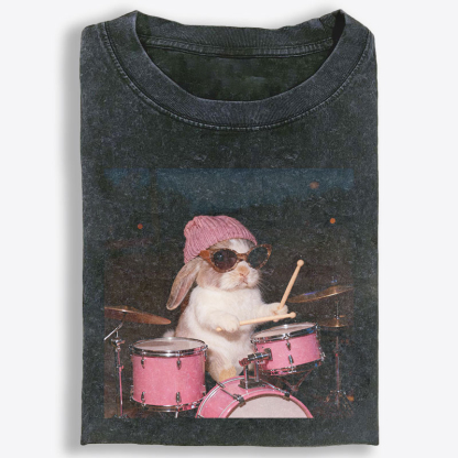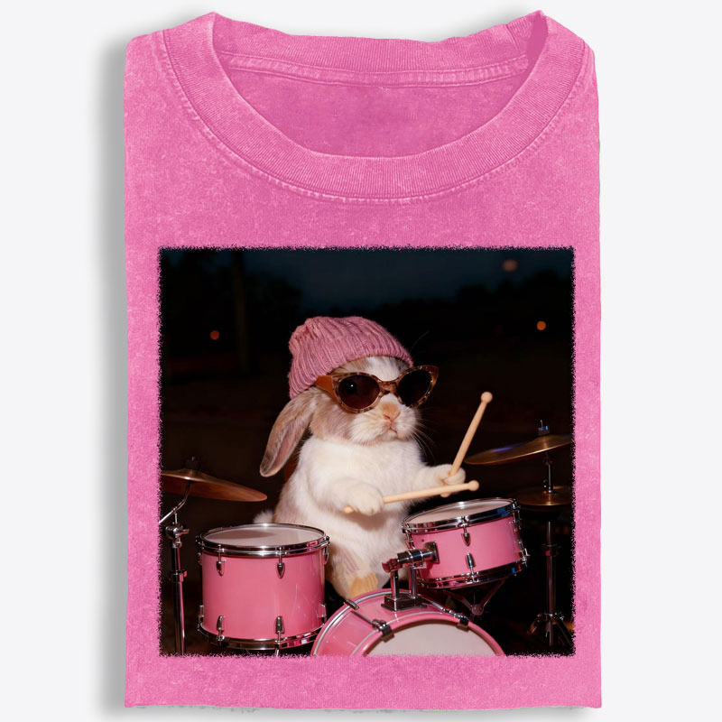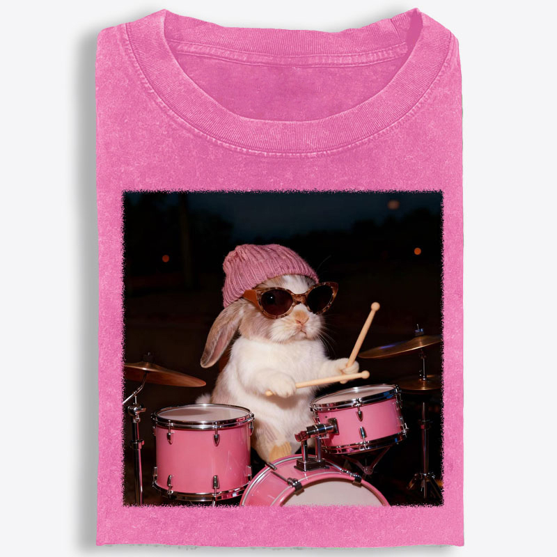 What makes this tee stand out is the graphic. Featuring a playful bunny behind a pink drum set, this design blends cute charm with cool performer energy in a way that feels instantly fun and memorable. Styled with a knit beanie and oversized sunglasses, the bunny gives off a confident, laid-back stage presence that adds attitude without trying too hard. The photo-style composition creates a trendy lifestyle feel, while the bright pink drums and relaxed expression make the artwork bold, eye-catching, and full of personality.