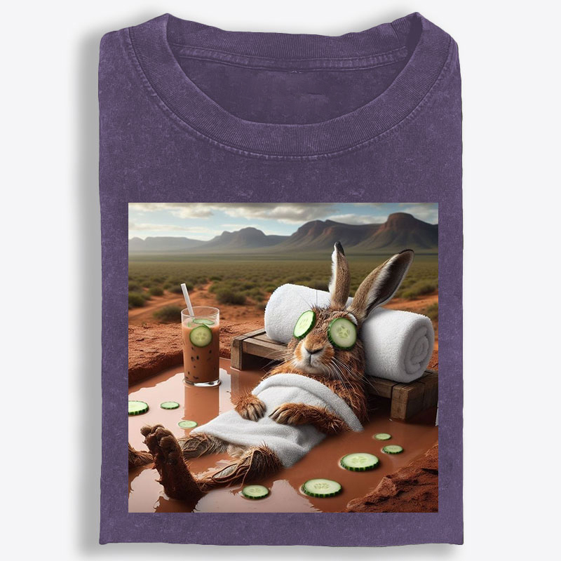 The standout feature is the playful spa-day bunny graphic. Reclining with cucumber slices over its eyes, wrapped in a towel, and surrounded by a surreal desert landscape, this bunny captures the ultimate “do not disturb” energy. The iced drink and spa setup add a modern self-care vibe, while the unexpected setting gives the design a humorous, eye-catching twist. It is cute, ironic, and effortlessly cool all at once—perfect for anyone who loves lighthearted graphics with personality.