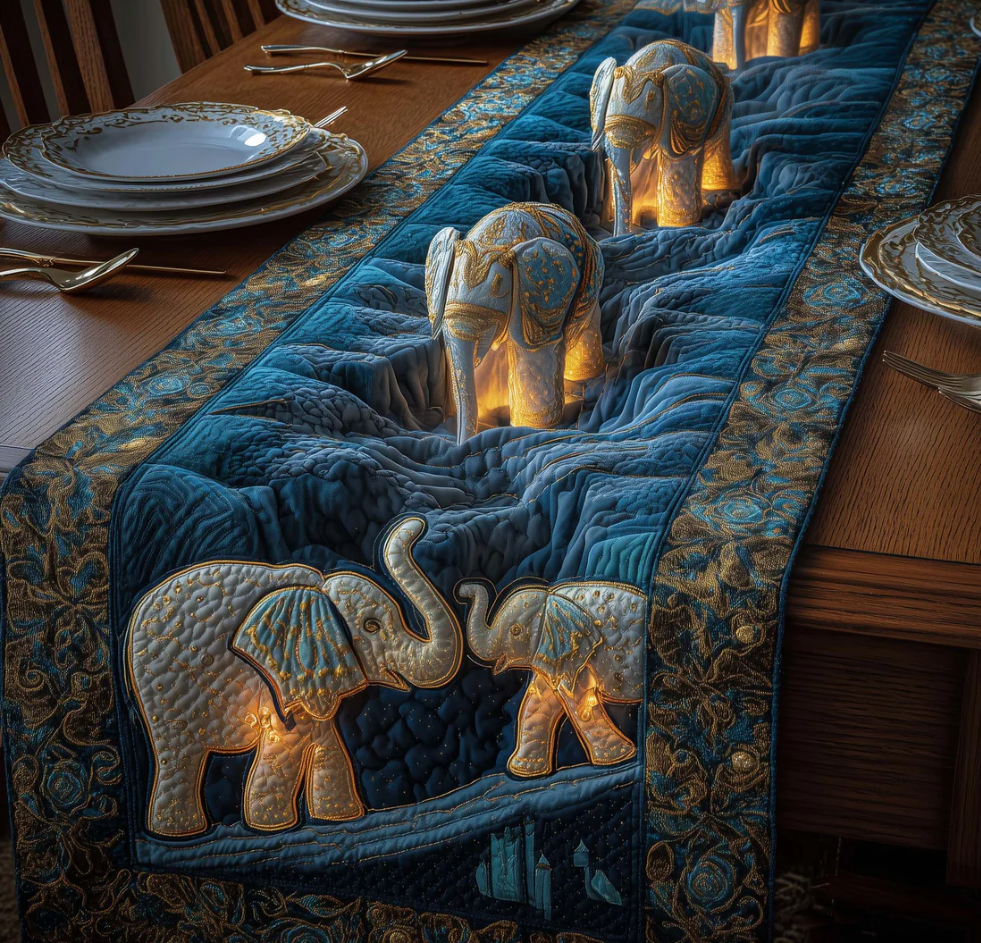 Forest Giant Quilted Table Runner Blue Velvet Elephant Family Pattern Dining Table Flag for Home Decor | Elephant