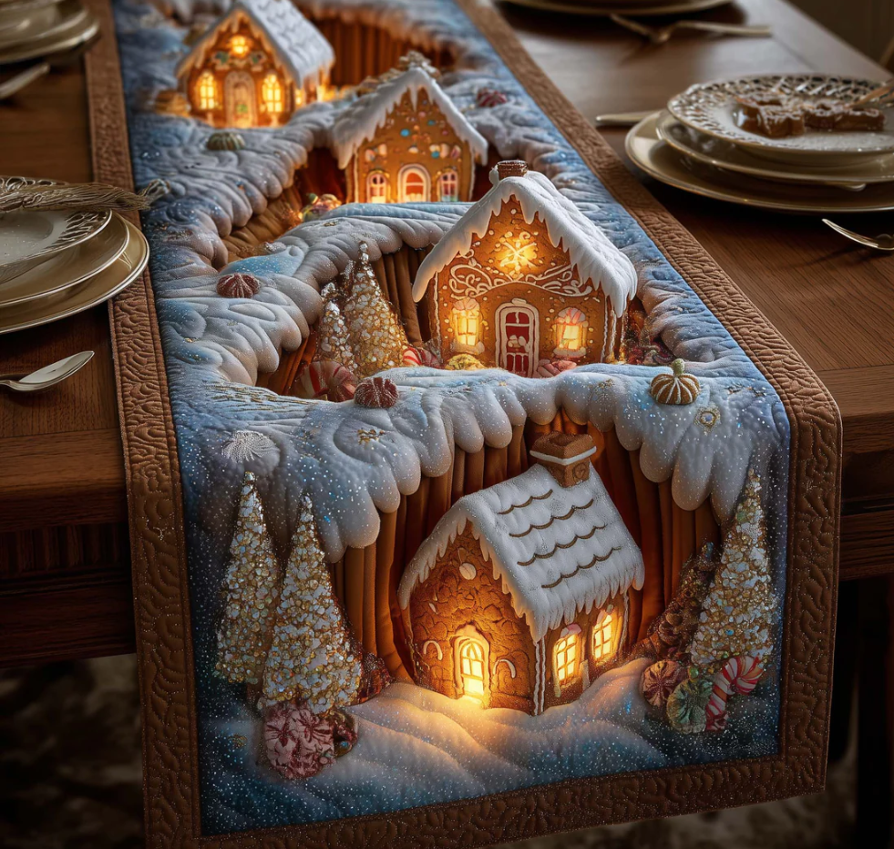 Gingerbread House Pattern Quilted Table Runner - Eco-Friendly & Machine Washable | House