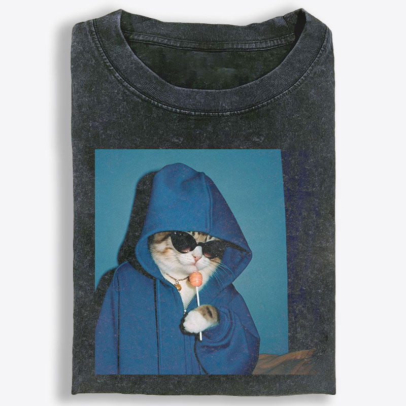 What makes this tee stand out is the graphic. Featuring a cool, low-key cat dressed in an oversized blue hoodie with dark sunglasses and a lollipop in paw, this design brings together clean streetwear attitude and playful meme-style charm. The monochrome blue tones create a sleek, modern visual that feels calm, confident, and instantly eye-catching without trying too hard. It is the kind of artwork that gives off laid-back energy with just enough edge—stylish, a little rebellious, and full of personality.
