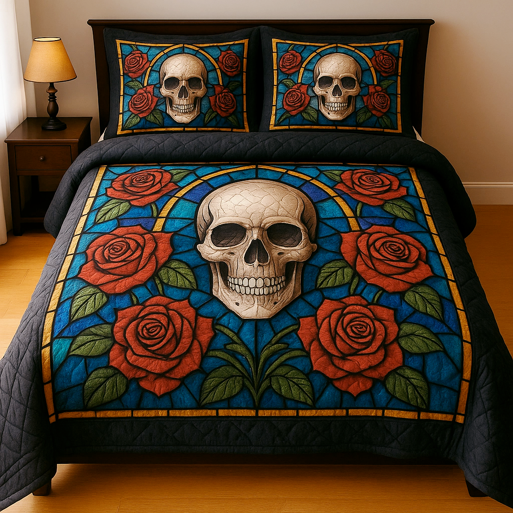 Marivn® Gothic Stained-Glass Skull & Scarlet Rose 3-Piece Quilted Bedding Set