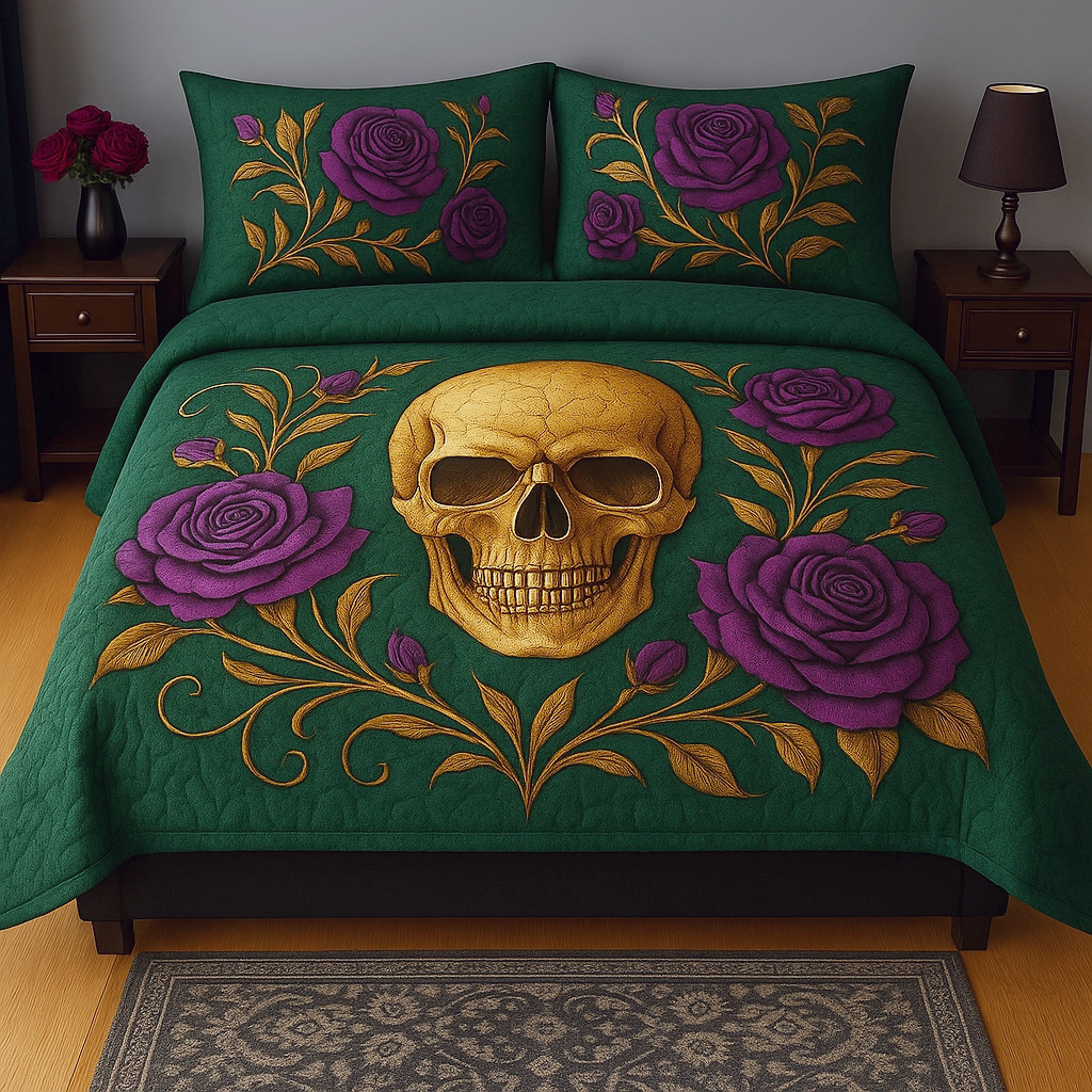 Marivn® Midnight Emerald Skull & Rose 3-Piece Quilted Bedding Set