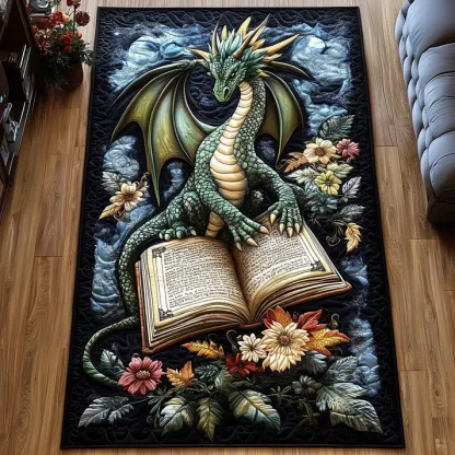 Medieval Epic Style Dragon & Ancient Book Array Pattern Quilted Runner Rug with Vintage Distressed Texture | Dragon