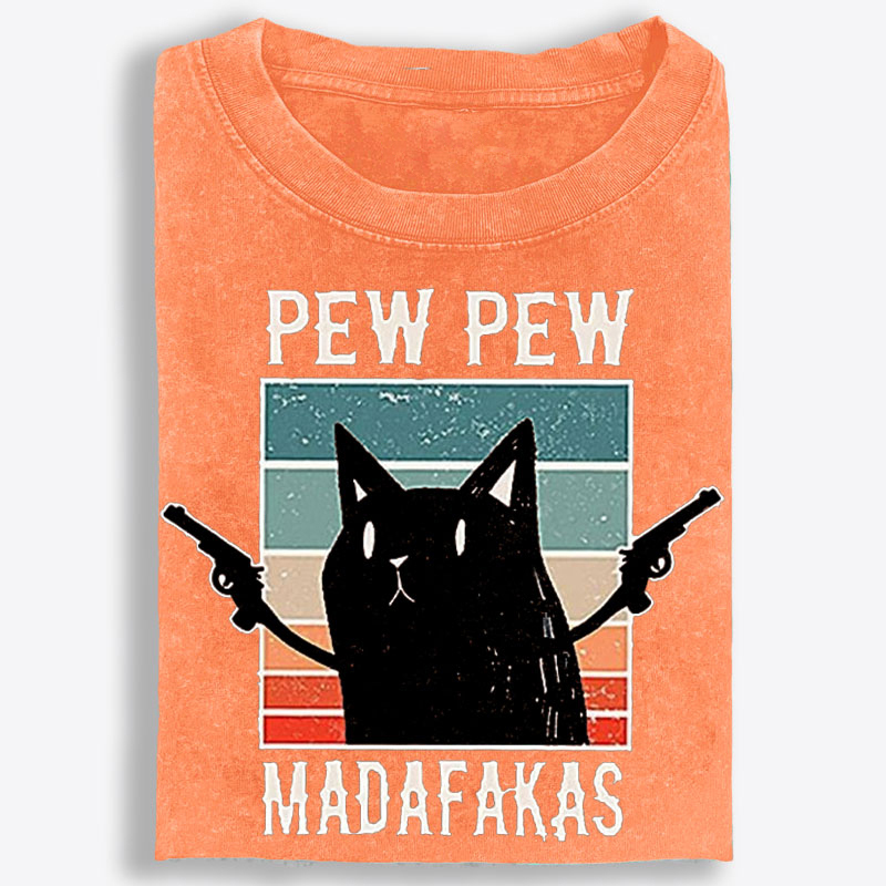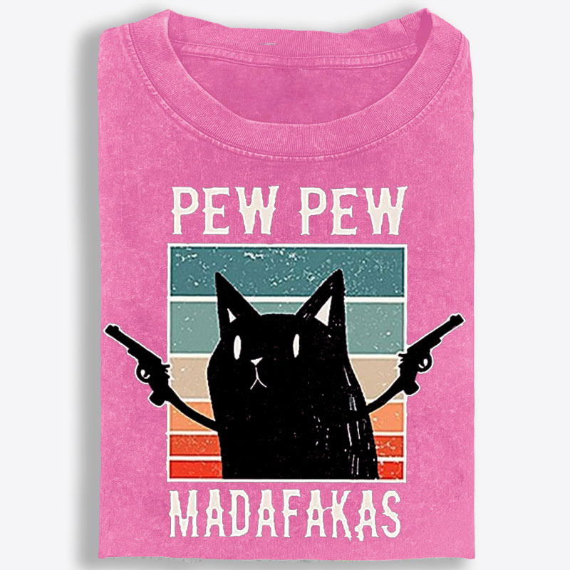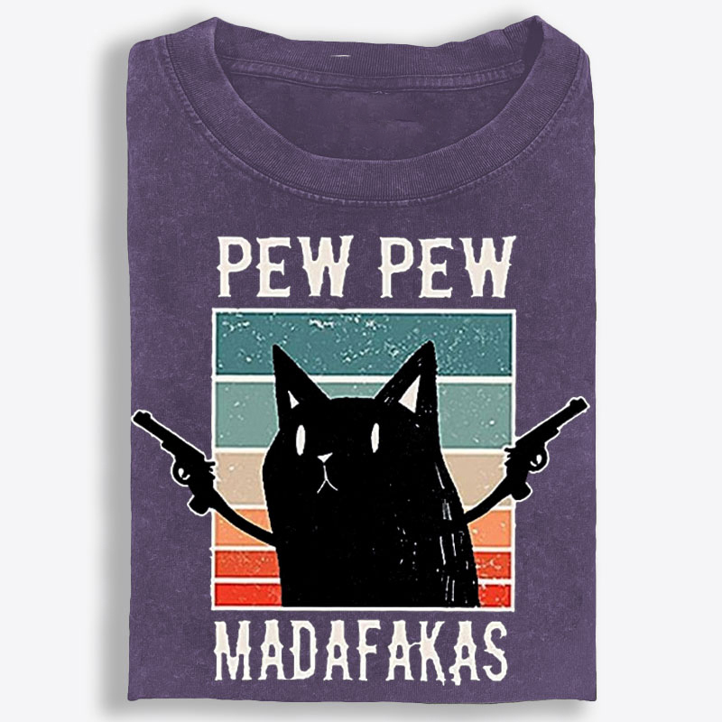 What makes this tee stand out is the graphic. Featuring a bold black cat paired with the phrase “Pew Pew Madafakas,” this design brings together deadpan feline energy, chaotic meme humor, and unapologetic attitude in one instantly eye-catching statement piece. Set against a retro sunset-style striped background, the cat’s simple silhouette and blank expression create the perfect contrast with the loud, rebellious tone of the artwork. The vintage-inspired layout gives it an old-school graphic tee feel, while the exaggerated humor and fearless energy make it impossible to ignore.