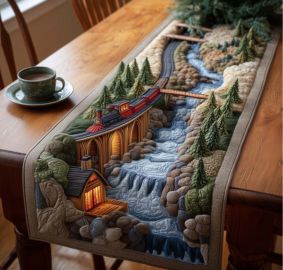Railway Journey Quilted Table Runner Forest Railway Stream Pattern Dining Table Flag for Home Decor | Forest Railway
