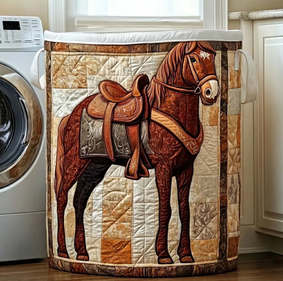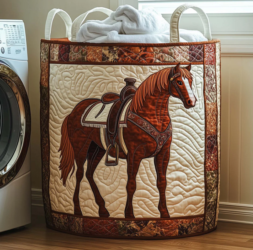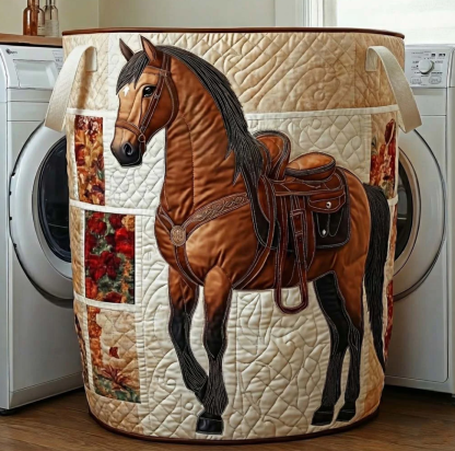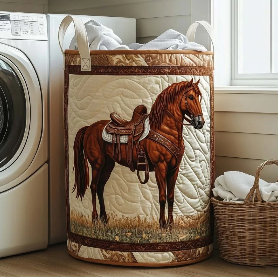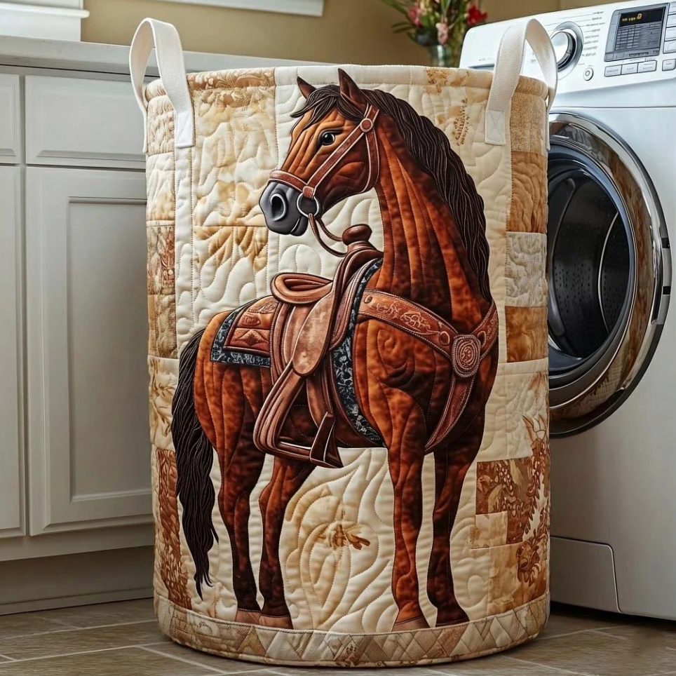Rustic Western Horse & Saddle Pattern Quilted Laundry Basket Eco-Friendly Machine Washable Storage Bin for Home Ranch Style Decor Organization | Horse