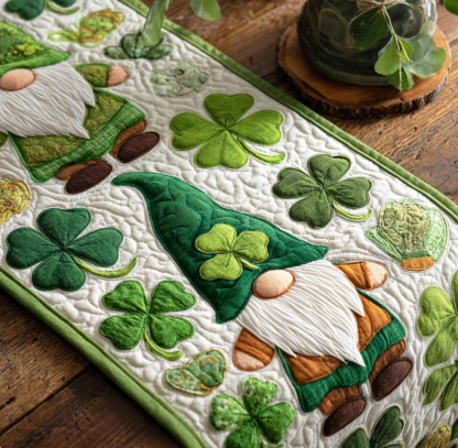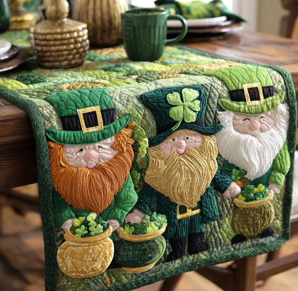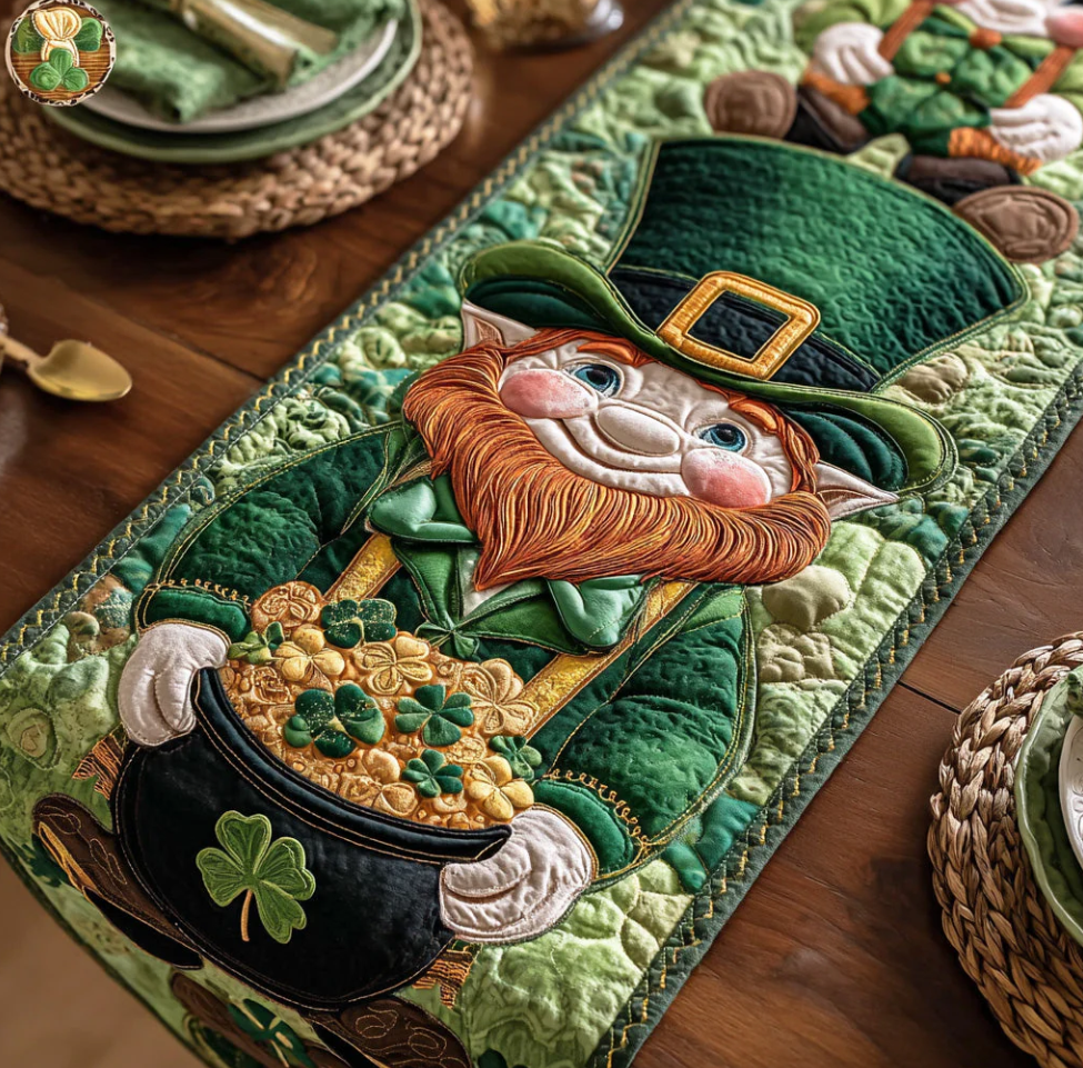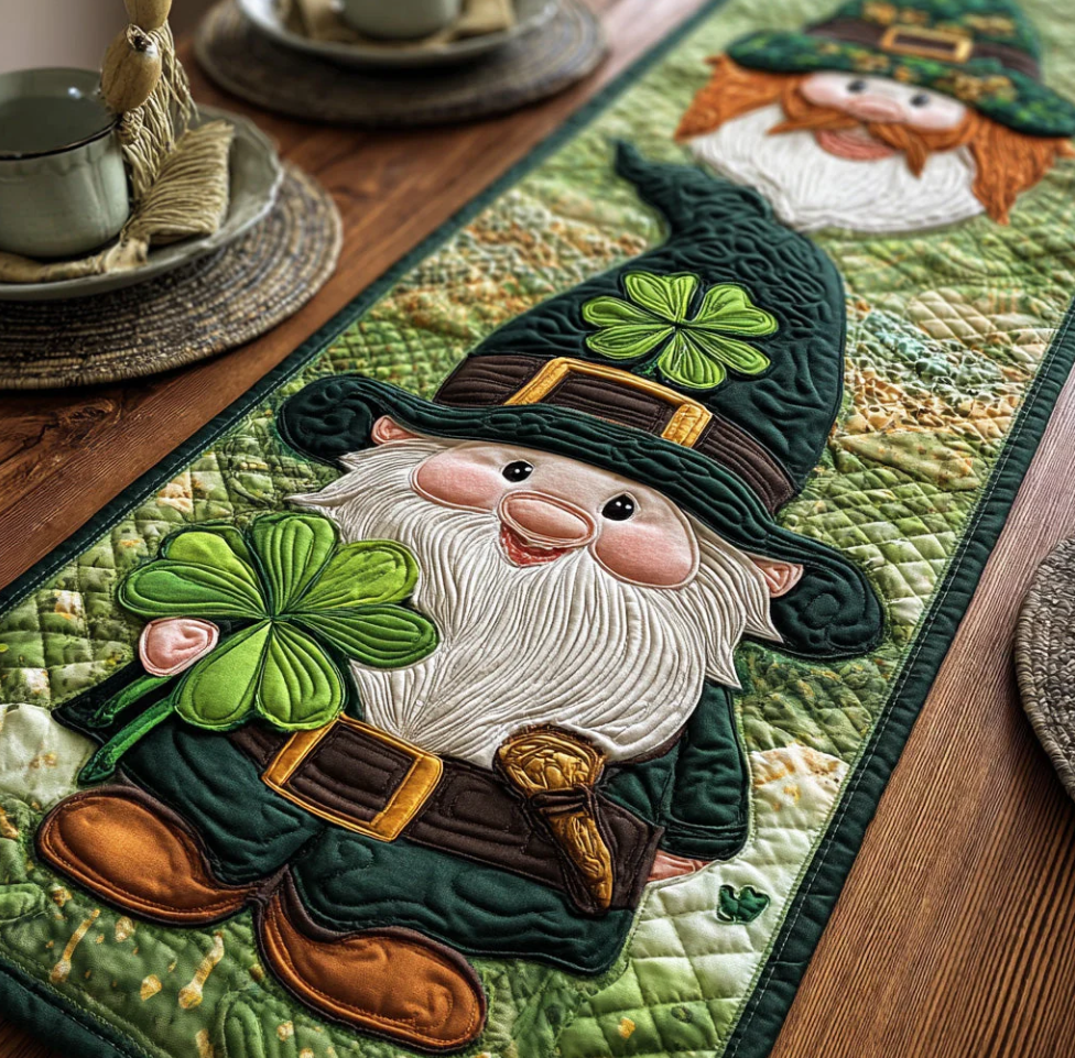 St. Patrick's Day Lucky Gnome & Leprechaun Pattern Quilted Table Runner with Emerald Shamrock Details | St. Patrick's Day