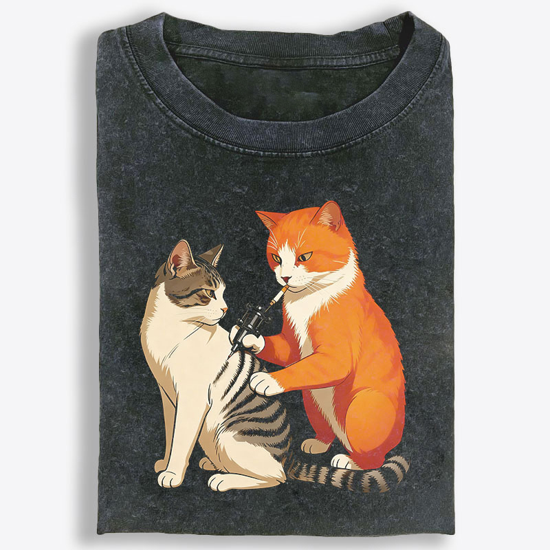 What makes this tee stand out is the graphic. Featuring a bold orange cat confidently holding a tattoo machine while working on another cat, this design turns a playful animal illustration into a funny, unexpected statement piece. The scene feels mischievous, creative, and full of attitude, making it the kind of artwork that instantly grabs attention and sparks conversation. The clean illustrated style keeps the design sharp and eye-catching, while the mix of humor, rebellious energy, and quirky storytelling gives it a strong personality that stands out from ordinary graphic tees.
