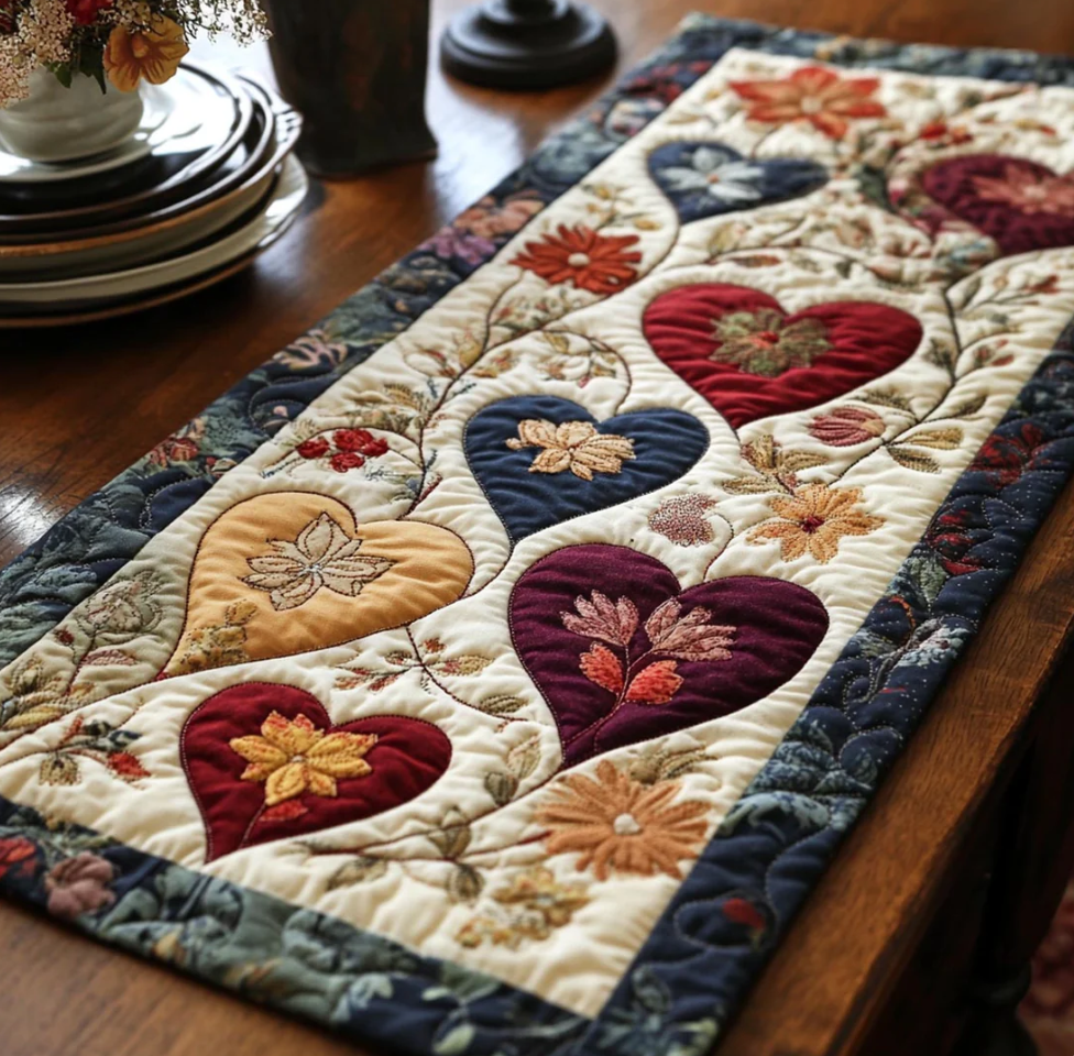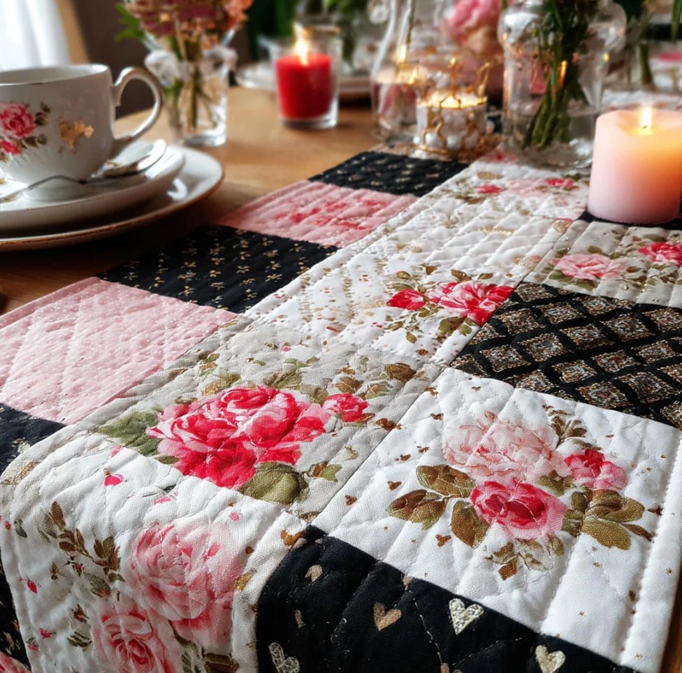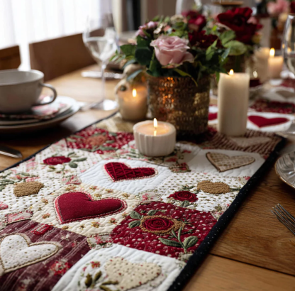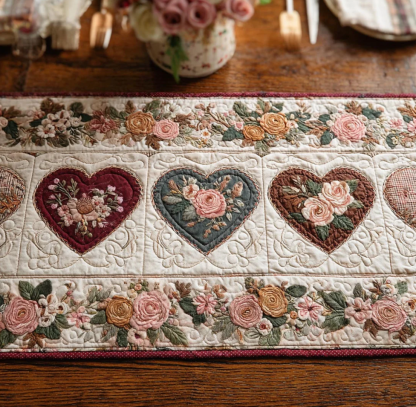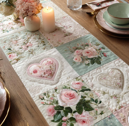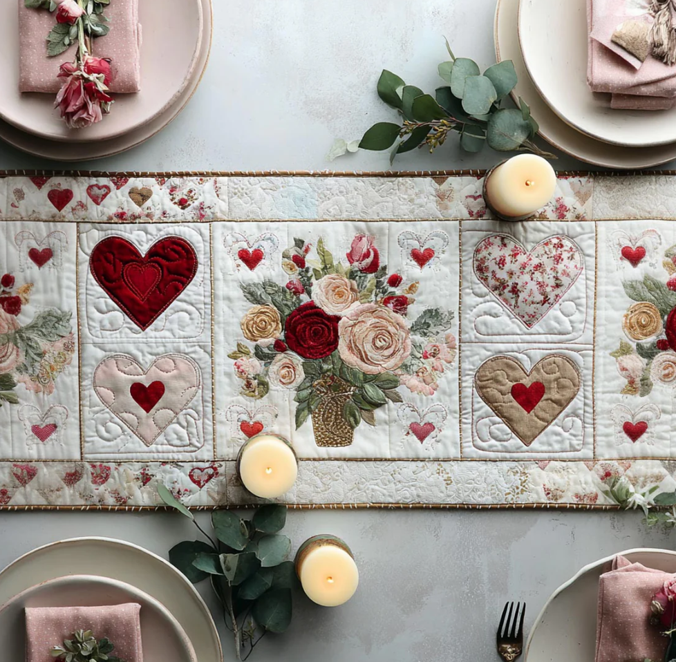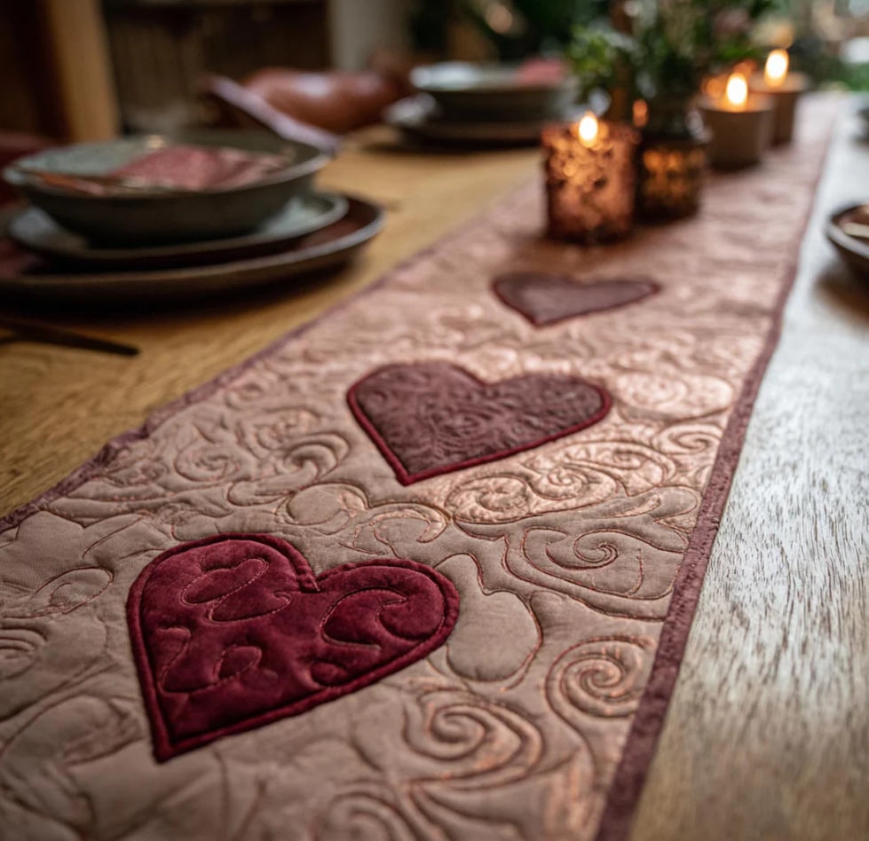 Valentine's Day Themed Love Heart & Floral Pattern Quilted Table Runner with Romantic Patchwork Design | Valentine's Day
