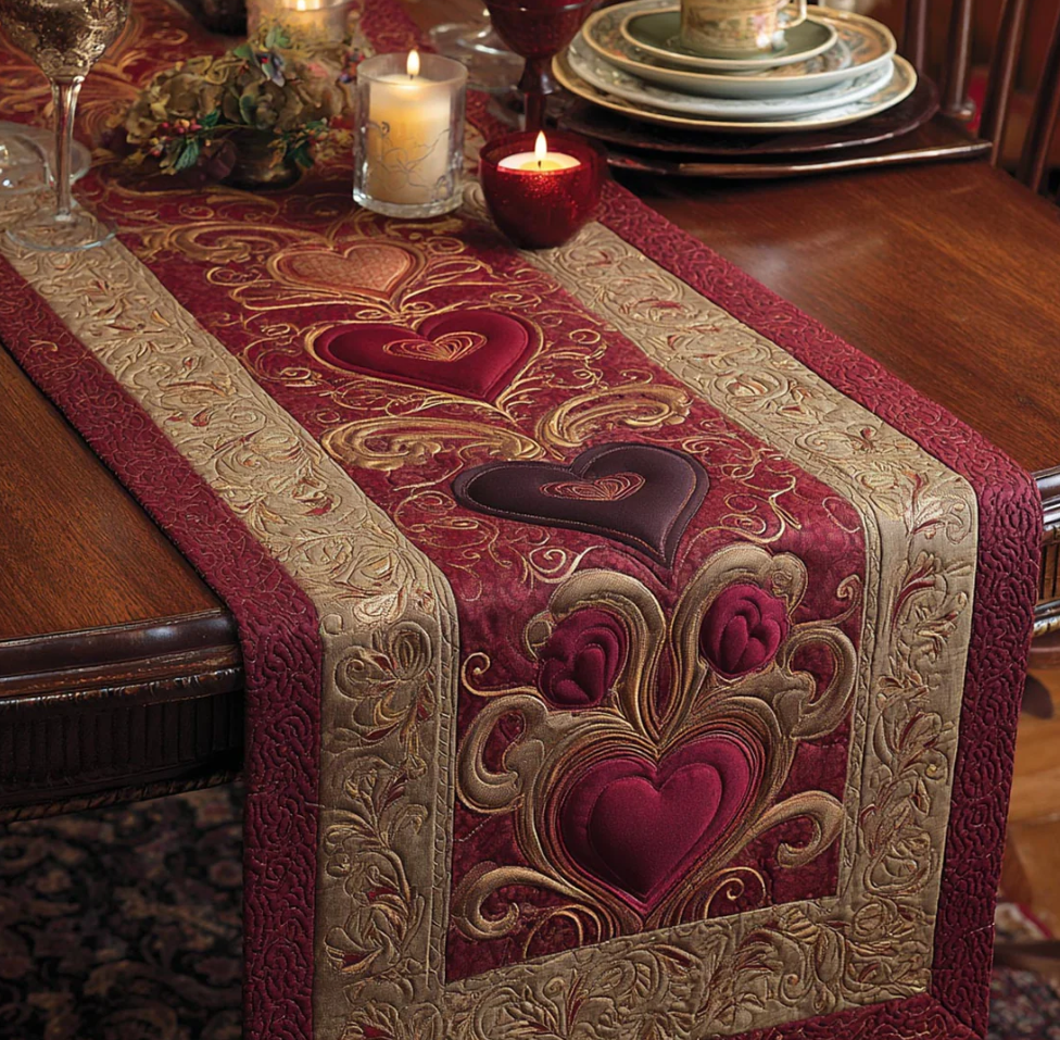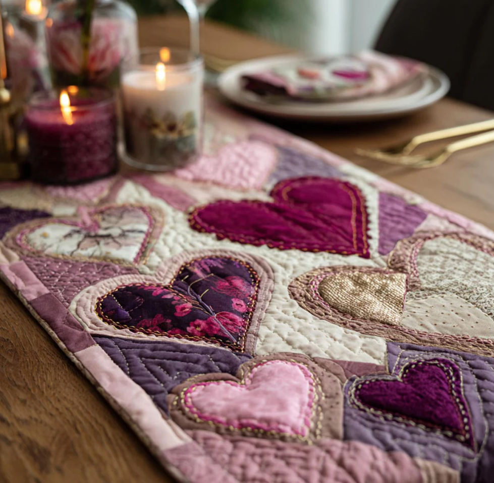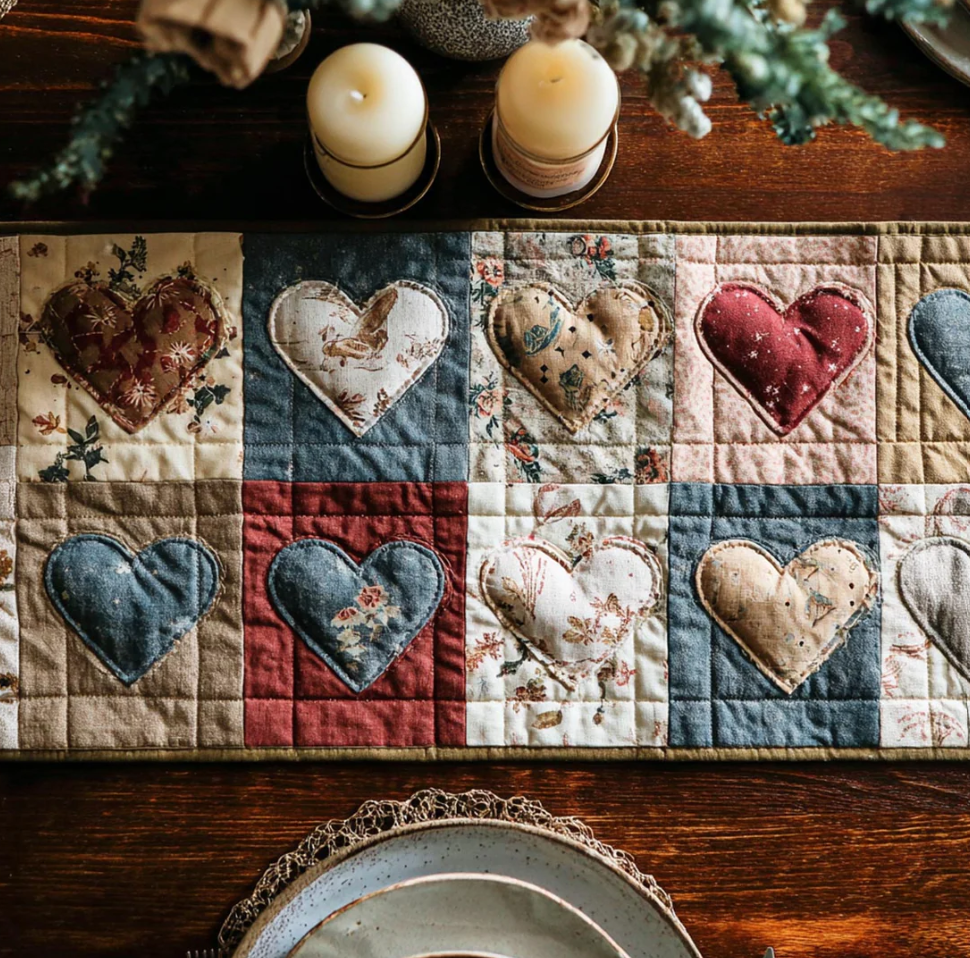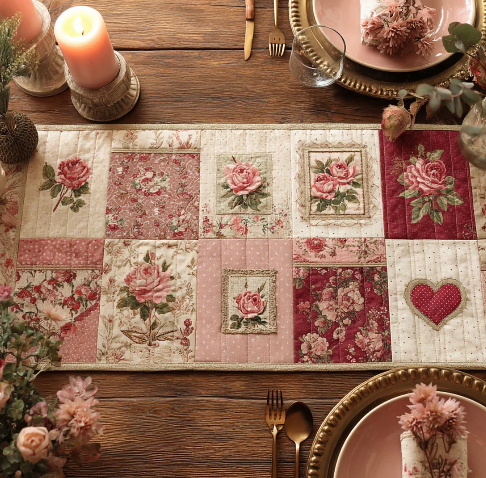 Valentine's Day Themed Love Heart & Floral Pattern Quilted Table Runner with Romantic Patchwork Design | Valentine's Day