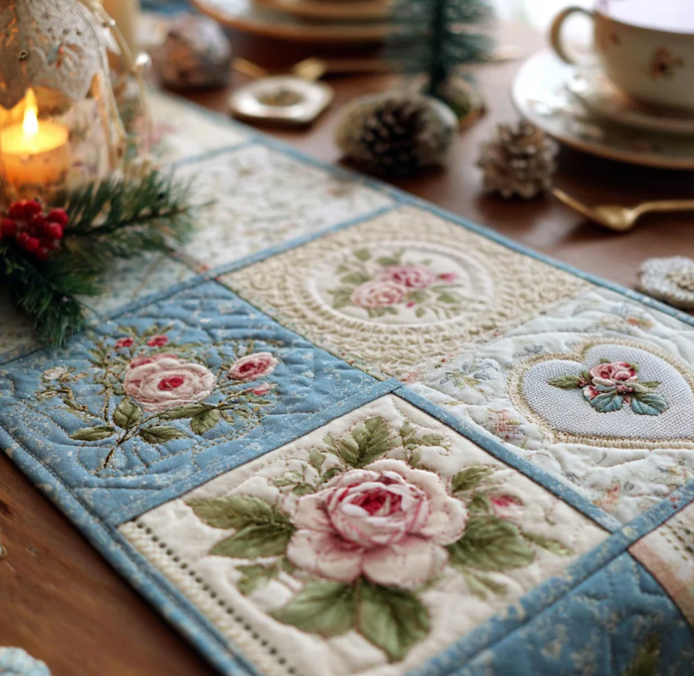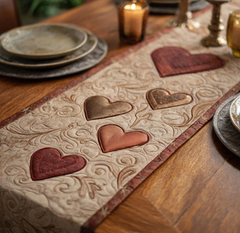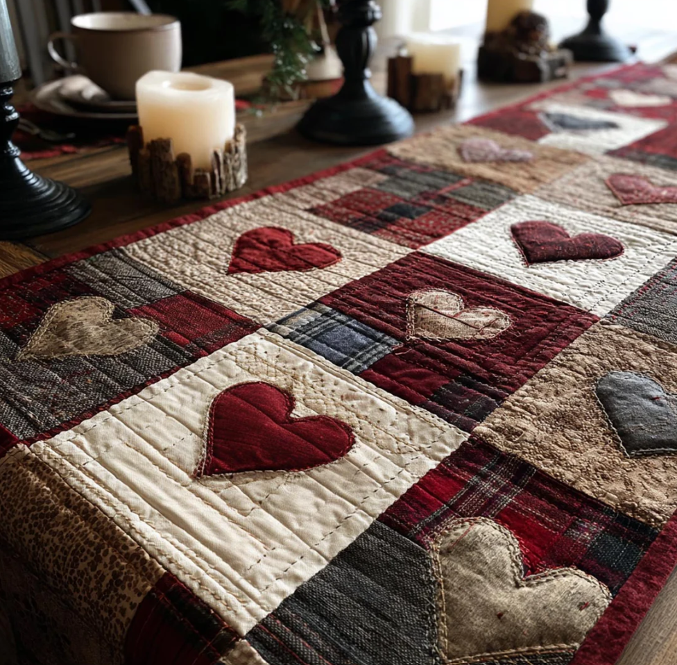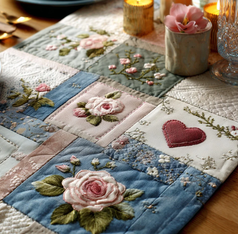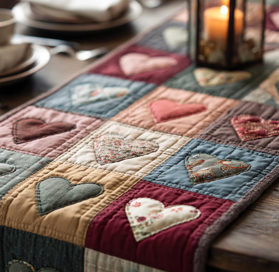 Valentine's Day Themed Love Heart & Floral Pattern Quilted Table Runner with Romantic Patchwork Design | Valentine's Day
