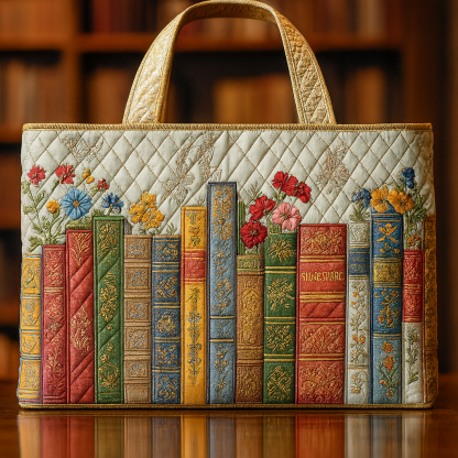 The Where Time Blooms Between the Books Quilted Tote Bag captures the quiet magic of a cozy library corner, where sunlight touches old book spines and tiny garden flowers seem to spring from the stories themselves. Each embroidered volume feels lovingly worn, as though passed from one reader to another, while the blossoms above whisper of chapters filled with wonder, hope, and gentle beginnings.