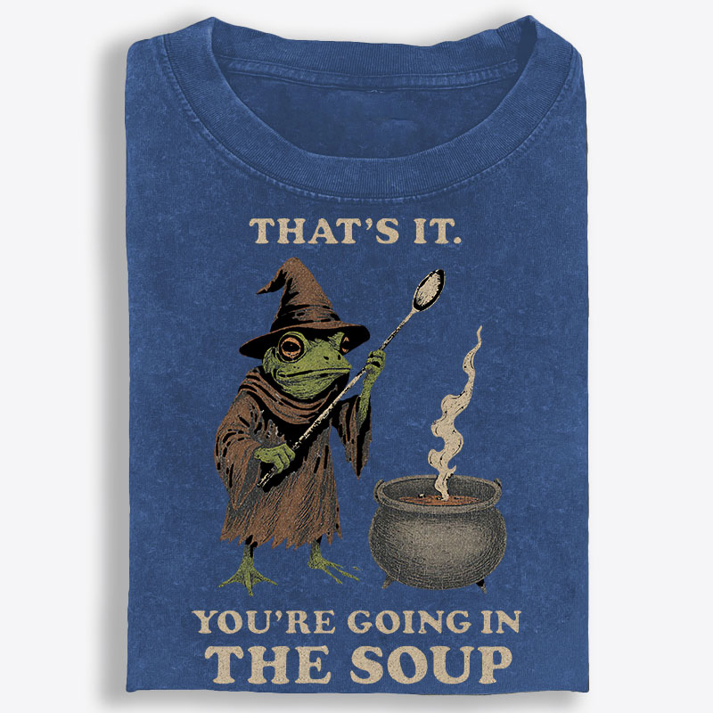 Vintage-style frog graphic with “That’s it. You’re going in the soup.” statement text