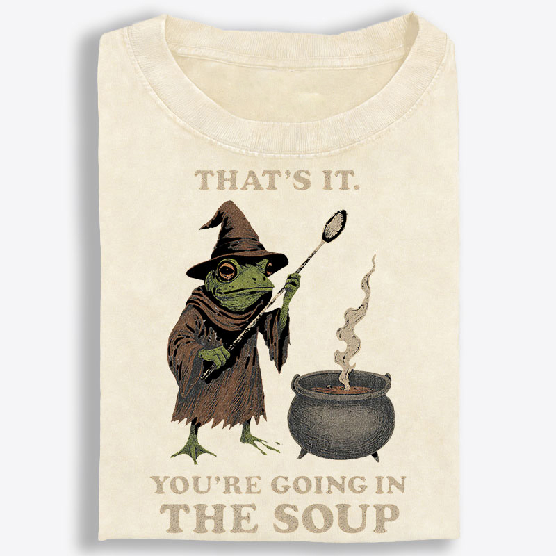 What makes this tee stand out is the graphic. Featuring a vintage-style witchy frog paired with the phrase “That’s it. You’re going in the soup.”, this design blends fantasy charm, dark humor, and absurd meme energy into one unforgettable statement piece. Dressed in a pointed hat and robe while standing beside a steaming cauldron, the frog brings a quirky magical vibe that feels both playful and slightly unhinged in the best way. The old-fashioned illustration style gives the artwork a retro storybook feel, while the dramatic wording adds a sarcastic twist that makes the design instantly eye-catching and full of personality.