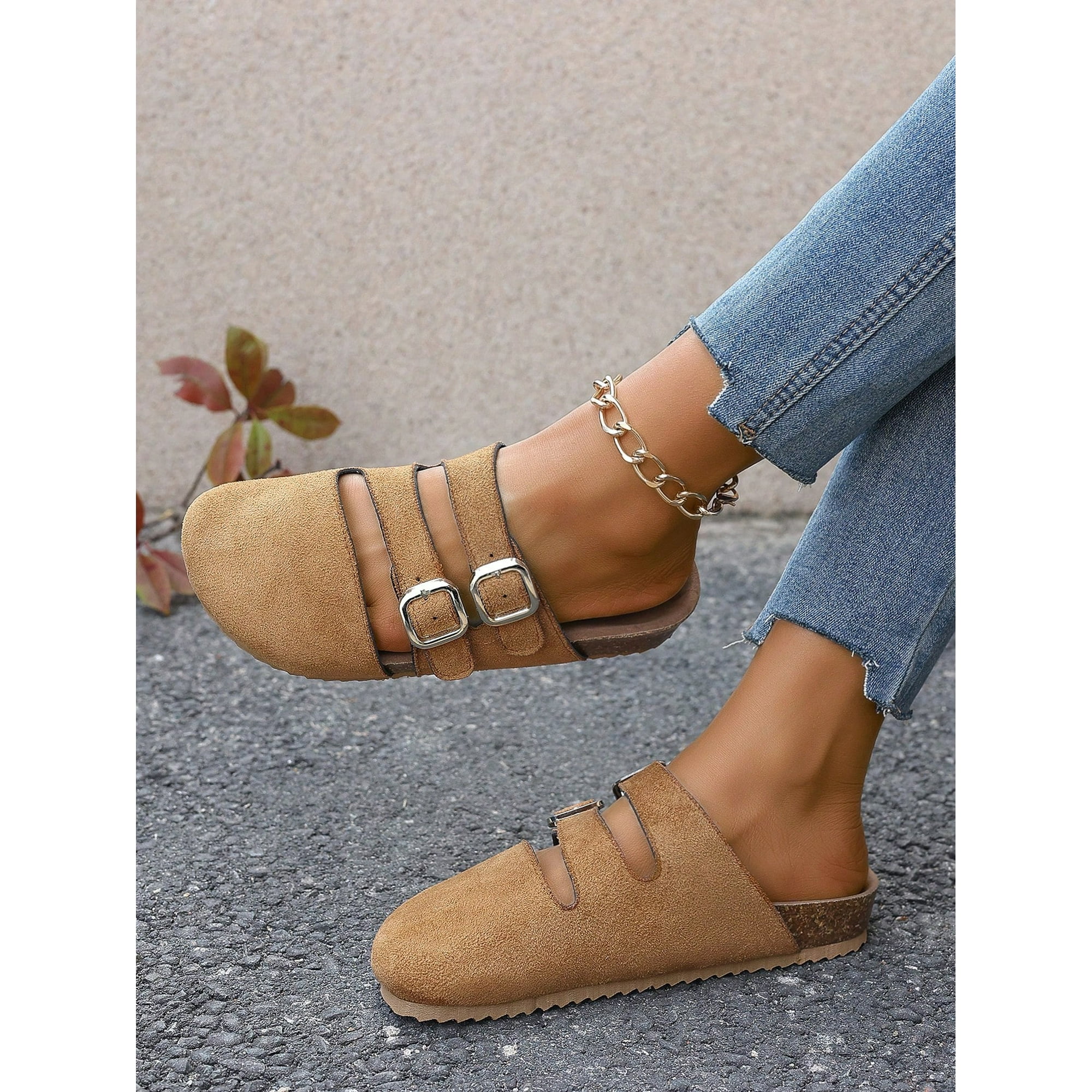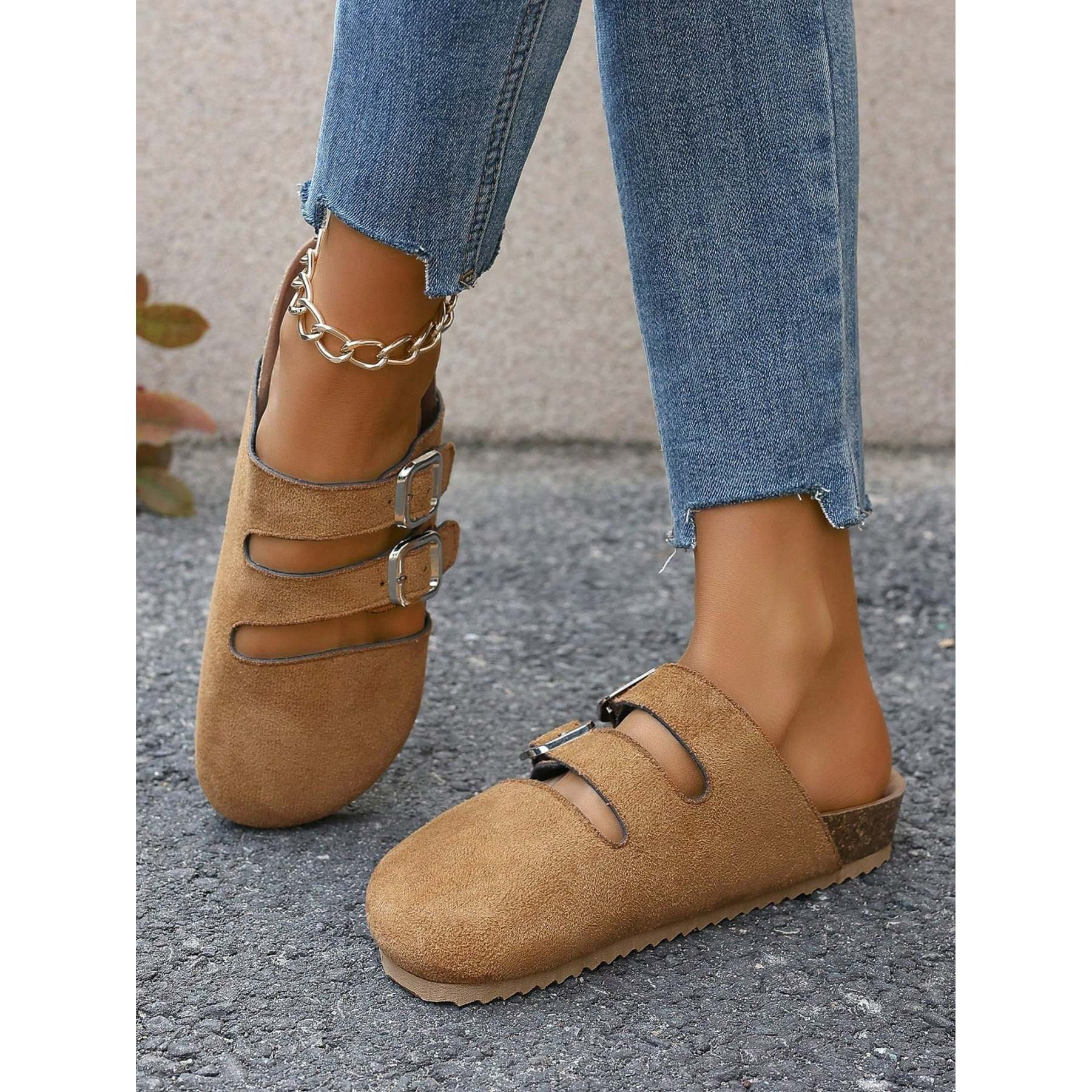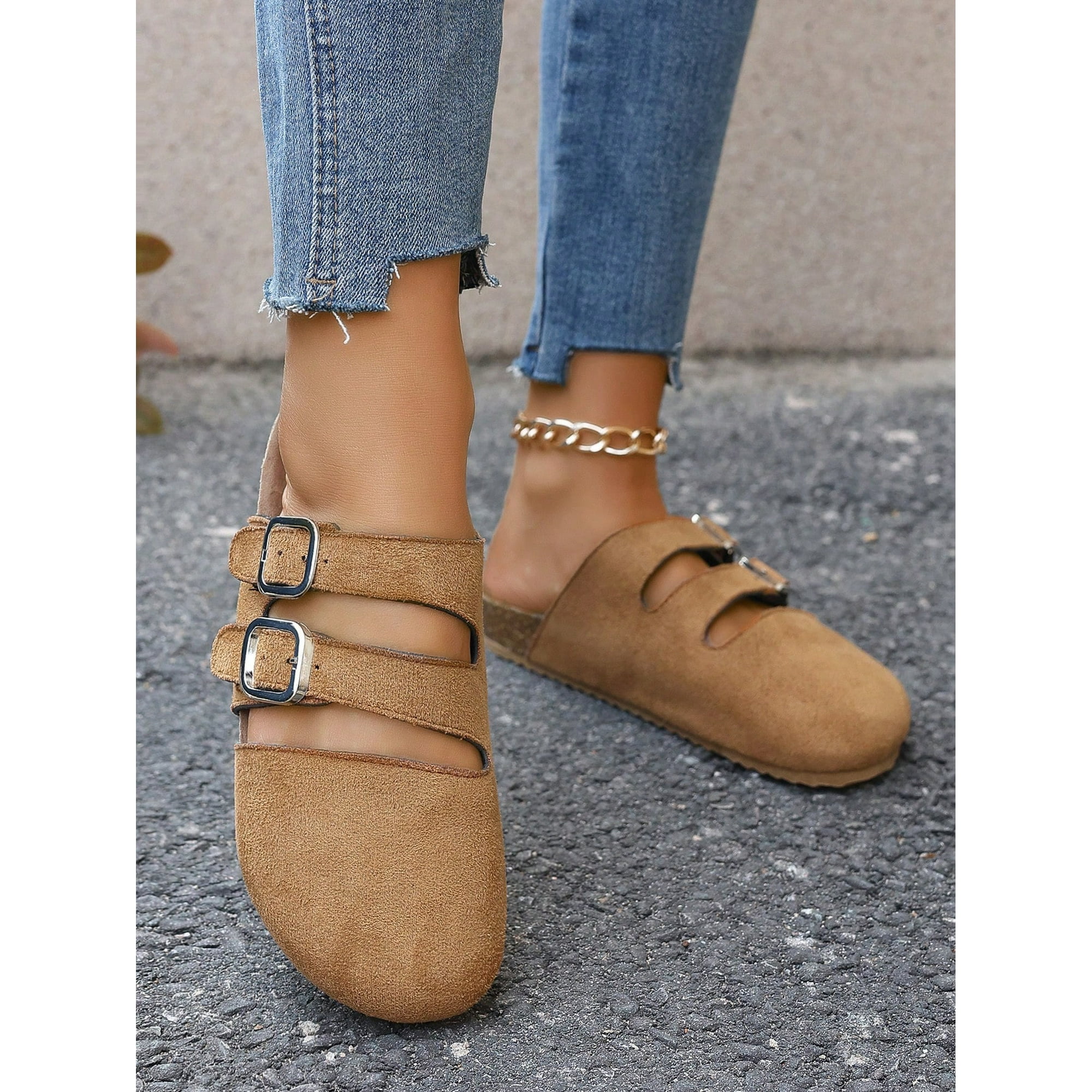 Women‘s Fashionable Hollow Out Closed Toe Slip On Slippers With Double Buckle Strap
